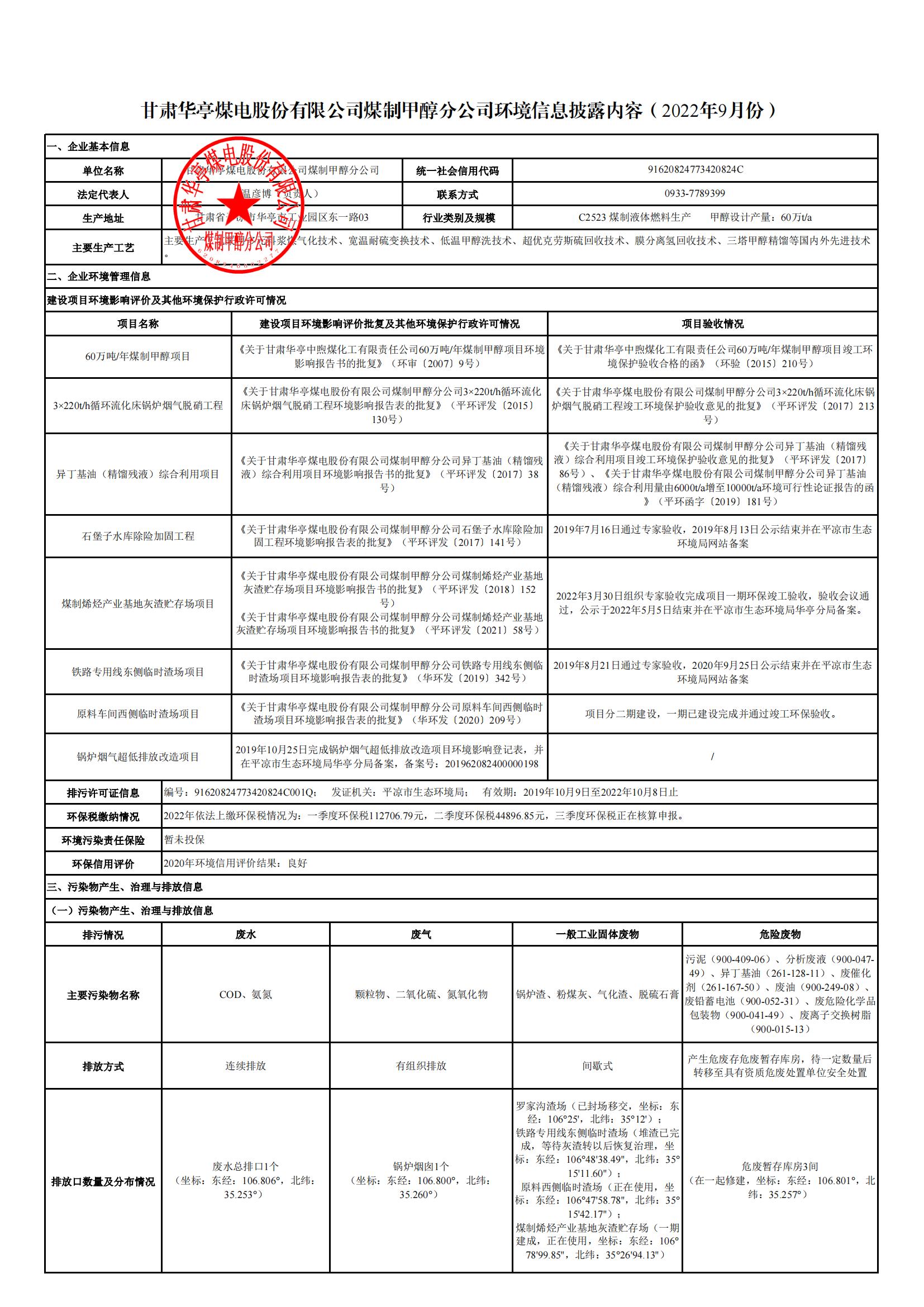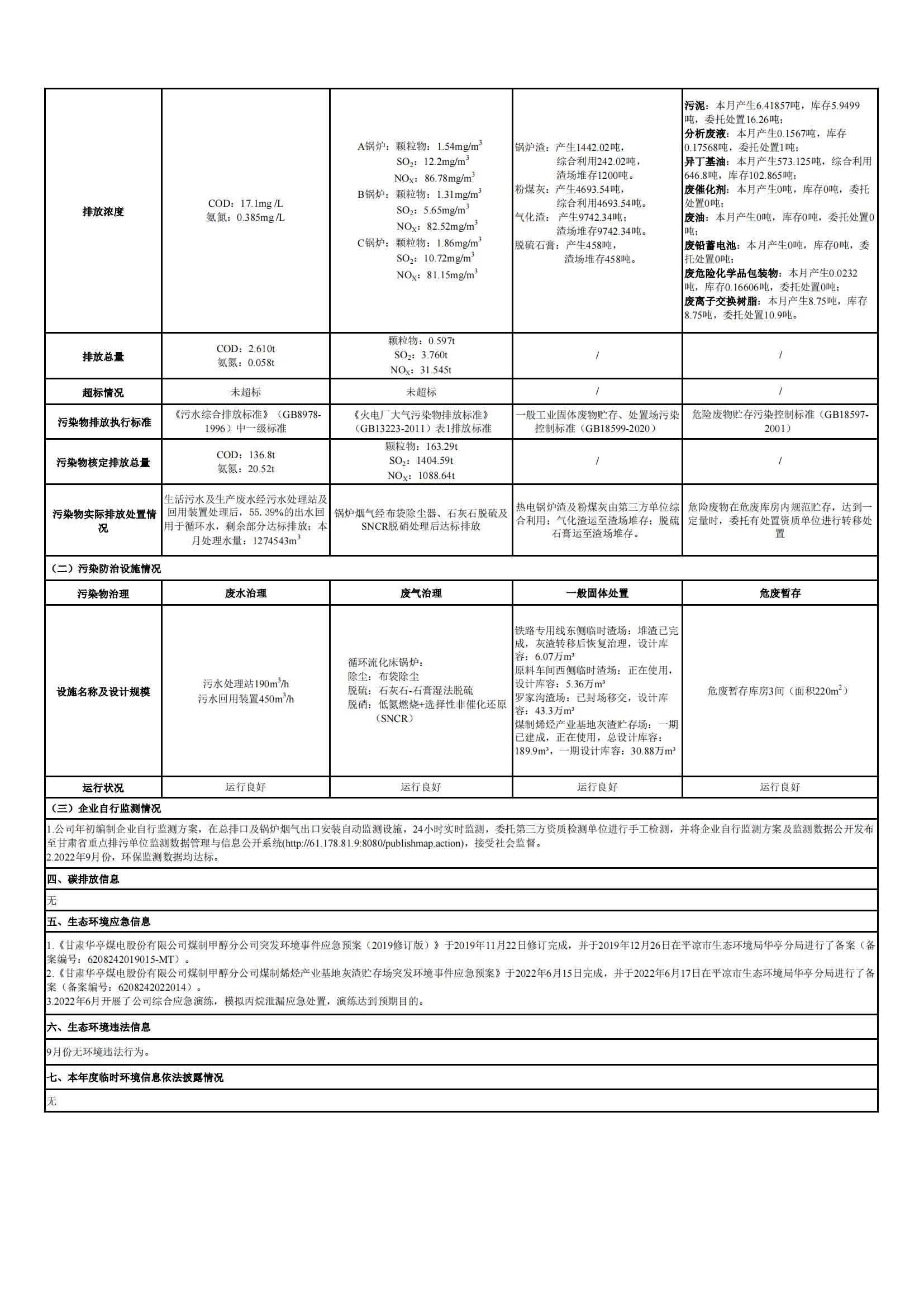 煤制甲醇分公司環(huán)境信息公開(kāi)內(nèi)容(2022年9月)